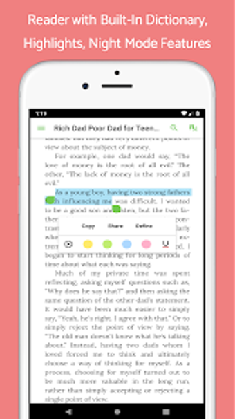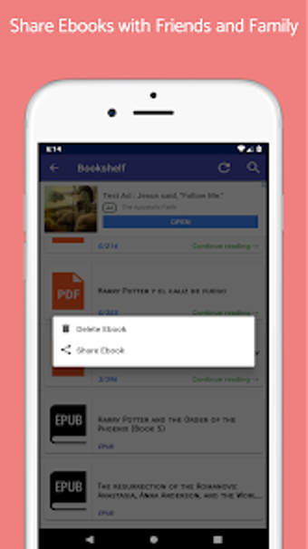 Freebooks มาพร้อมกับ Bookshelf ที่จัดเก็บหนังสือที่ดาวน์โหลดไว้ทั้งหมด ซึ่งสามารถแชร์กับเพื่อนและครอบครัวหรือส่งไปยังคอมพิวเตอร์ได้ แอปยังมีตัวอ่าน PDF/EPUB แบบอินบิลที่ใช้ในการอ่านหนังสือโดยไม่ต้องใช้ซอฟต์แวร์เพิ่มเติม